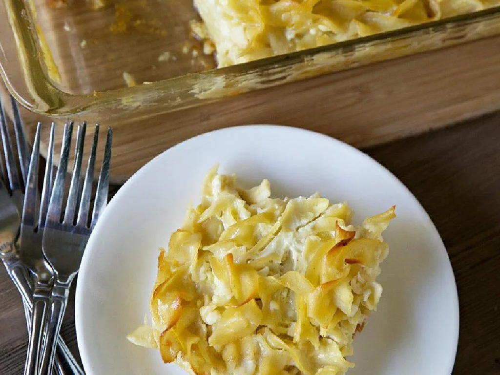 Boil noodles and drain. Add ¾ cup of butter. Cream the sugar and cream cheese. Beat eggs and add to the mixture. Add the milk and apricot jam slowly. Mix all together. Put in a 9 x 12 buttered Pyrex pan. Add the topping.