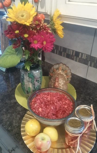 My contribution is a cranberry relish made from fresh cranberries and citrus fruit. It has graced the family Thanksgiving table over the last 20 years. The cranberry relish is not only good with turkey, but also on sandwiches and served with cheese platters. I make a big batch to give away for the holidays, wrap it jelly jars, and with friends and neighbors.