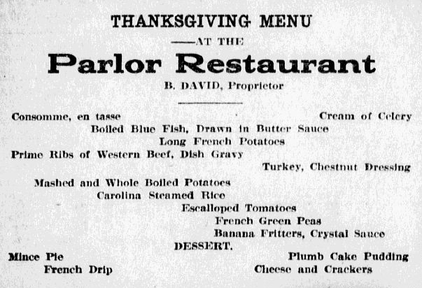 Advertisement promoting Thanksgiving at Ben David’s Parlor Restaurant, 1910. Reprinted from The State, November 22, 1910.
