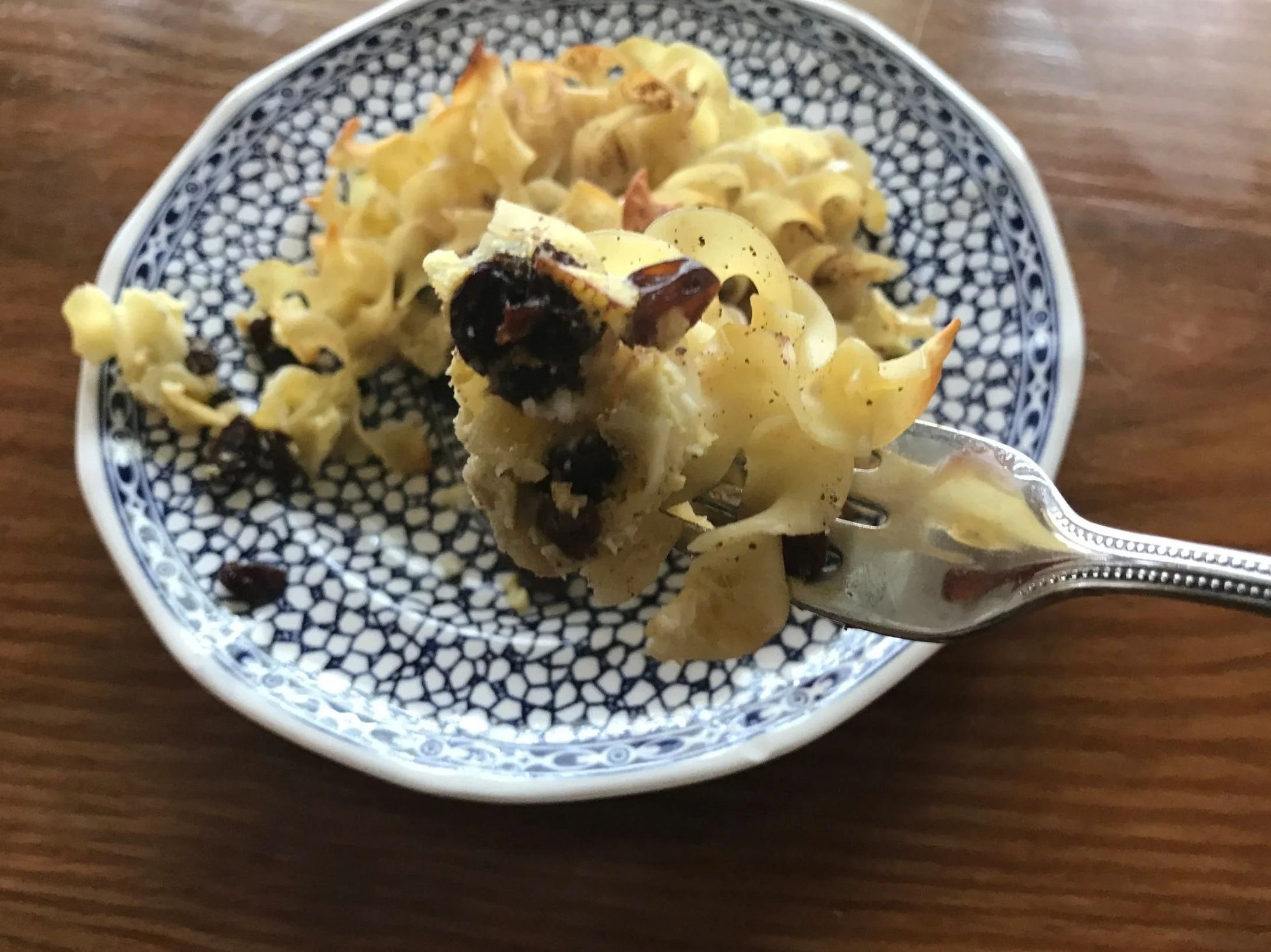 My earliest memories of a kugel are that of egg noodles combined with eggs, milk, butter, cinnamon, sugar and raisins baked into a sweet dish that was, it seemed, always on our dinner table. This kugel must have been my paternal grandmother’s recipe that she taught to Ethel Glover, the African-American woman who cooked for three generations of the family. It’s a recipe that wasn’t written down, but through trial and error (and many other recipes in various cookbooks) I have managed to duplicate. I must add that it’s not my favorite kugel but, it’s the one from my childhood that takes me back to our family dinner table of fried chicken, seasonal fresh vegetables, and kugel. This may not sound quite as healthy as we eat today, but it was homecooked and always fresh.