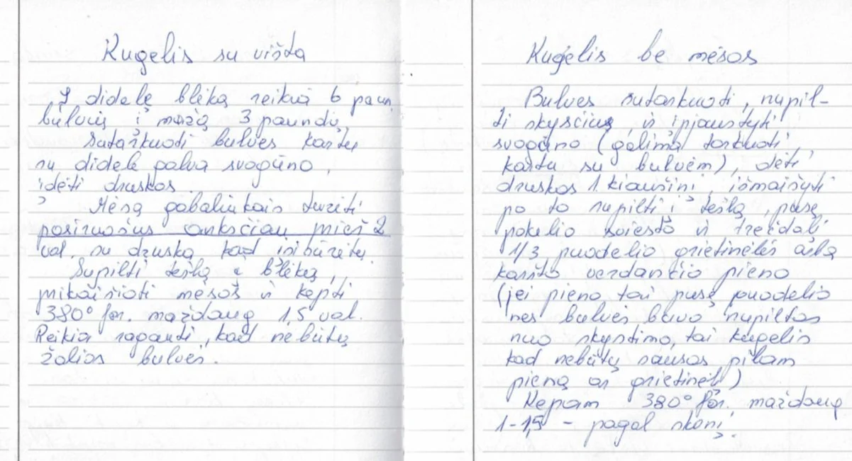 Christine has sent two recipes: One is the handwritten recipe (in Lithuanian) by her mother-in-law Birute Beresniova. It features kugelis both with chicken and one without meat.