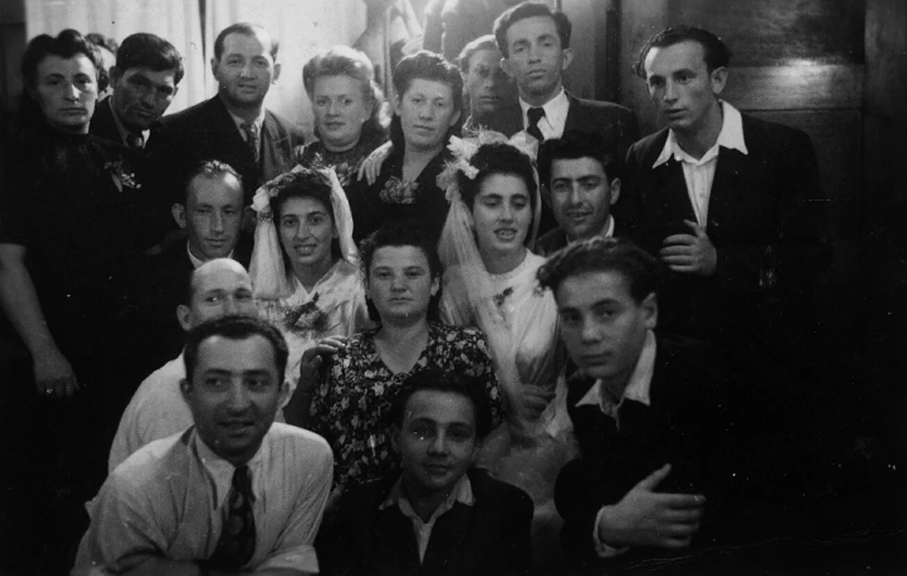 The double wedding of Cela and Bluma Tyszgarten to David Miller and Felix Goldberg in a displacement camp in Landsberg, Germany in July, 1946.